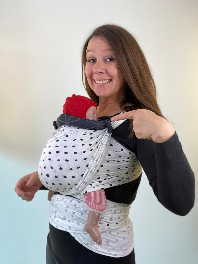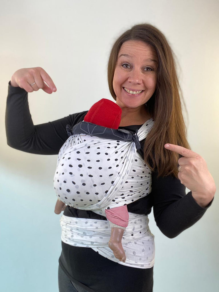 Zum einen kannst du bei einem elastischen Tuch die Luftzufuhr bei deinem Baby verbessern, wenn du die Stränge zusammenknotest, zum anderen weil der Nacken deines Babys ganz nebenbei optimal gestützt wird.